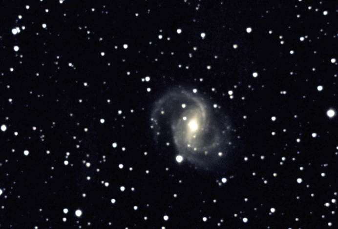 NGC 6951, which is 78 million light-years away, was discovered by a French astronomer, Jerome Caggia, in 1877 and found again independently by the American Lewis Swift in 1878. Stretching 75,000 light-years across, it is classified as an intermediate spiral galaxy, meaning it is something like a barred spiral and something like a spiral without a bar. The spiral arms do not swing out from a clear-cut central core; it’s termed weakly-barred.
