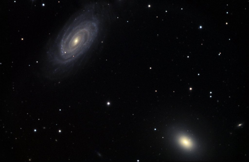 “My experience last night at Lakeside was glorious. It was a bit frustrating too, as I had a terrible time getting the telescope on the North Star, and I had to collimate twice — and once is difficult enough. But when everything was ready, around 2 a.m., I instructed the ‘scope to go to a cluster of three galaxies called the NGC5985 cluster in Draco — and it went to it precisely. The top two members of the cluster showed up as soon as I made a focus exposure. I don’t remember the last time, if I ever had one, when the target immediately showed up in the field of view of the camera. I spent the time from then until dawn making a sequence of exposures of the three, for a two-part mosaic. That’s because the galaxies are far enough apart that I can’t get more than two in an exposure.