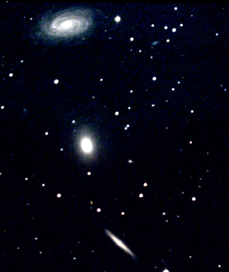 Since then I have abandoned that camera with its small chip. My present instrument could easily fit all three galaxies in one view. But back in 2014 I had to take sets of photos of the top and middle galaxies, then the middle and bottom ones. Total exposure was about four hours. Next I brought the sets together in a mosaic, showing all three in proper orientation.